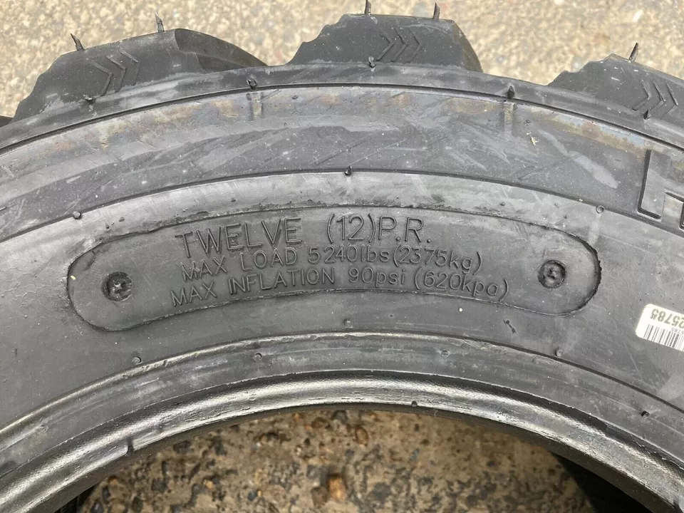 Dit is een tubeless band met een gewicht van ongeveer 44 pond met een draagvermogen van 5240 pond per band – MAX. 90 PSI. Geschatte ongemonteerde afmetingen – 30″ hoog – totale bandbreedte inclusief velgbescherming 10″. 17/32 loopvlakdiepte.