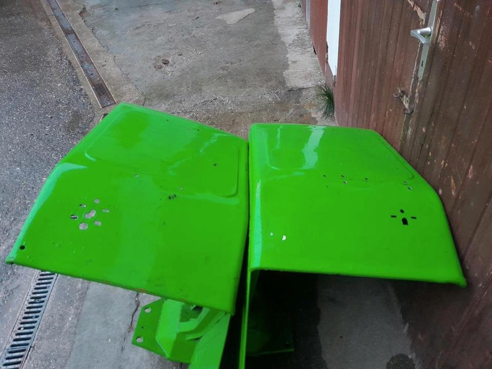 Deutz 8006, 10006, 13006 spatborden.Afstand tussen de gaten in de montageplaat: 160×160 mm.Ze zijn in redelijk goede staat.De vorm zelf is nog correct en ze zijn niet kromgetrokken. De prijs is voor de set